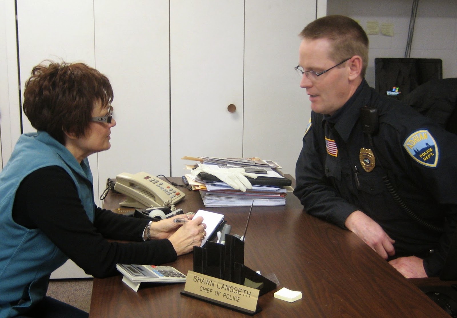 Feathers. That’s what Librarian Meredith Vaselaar found when she opened the Adrian Branch Library on Monday, March 24, 2014. She placed a frantic phone call to our fine Chief of Police Shawn Langseth. He arrived at the Library to find a frazzled Vaselaar frantically pacing the floor.