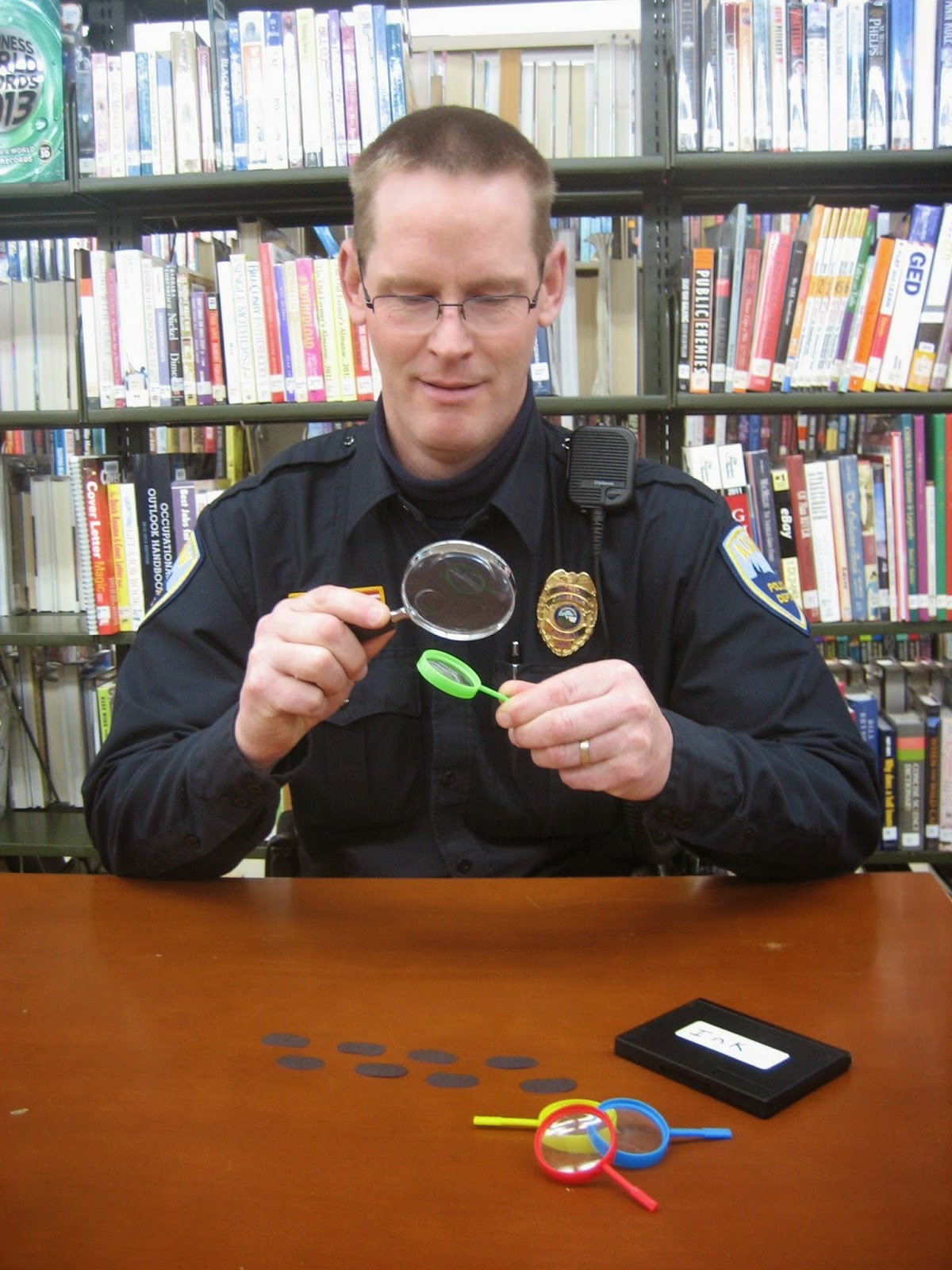 Beneath the glare of the overhead light, Chief Langseth studied the latest bits of evidence: four magnifying glasses, a pencil, a notebook with a torn page that said, “Who Done It?” Then there was the inkpad from the circulation desk, from which miniature footprints seemed to lead away. Was it possible those were REAL footprints, or were the perps playing with him? Had the criminals been clumsy, or were the footprints an elaborate hoax?