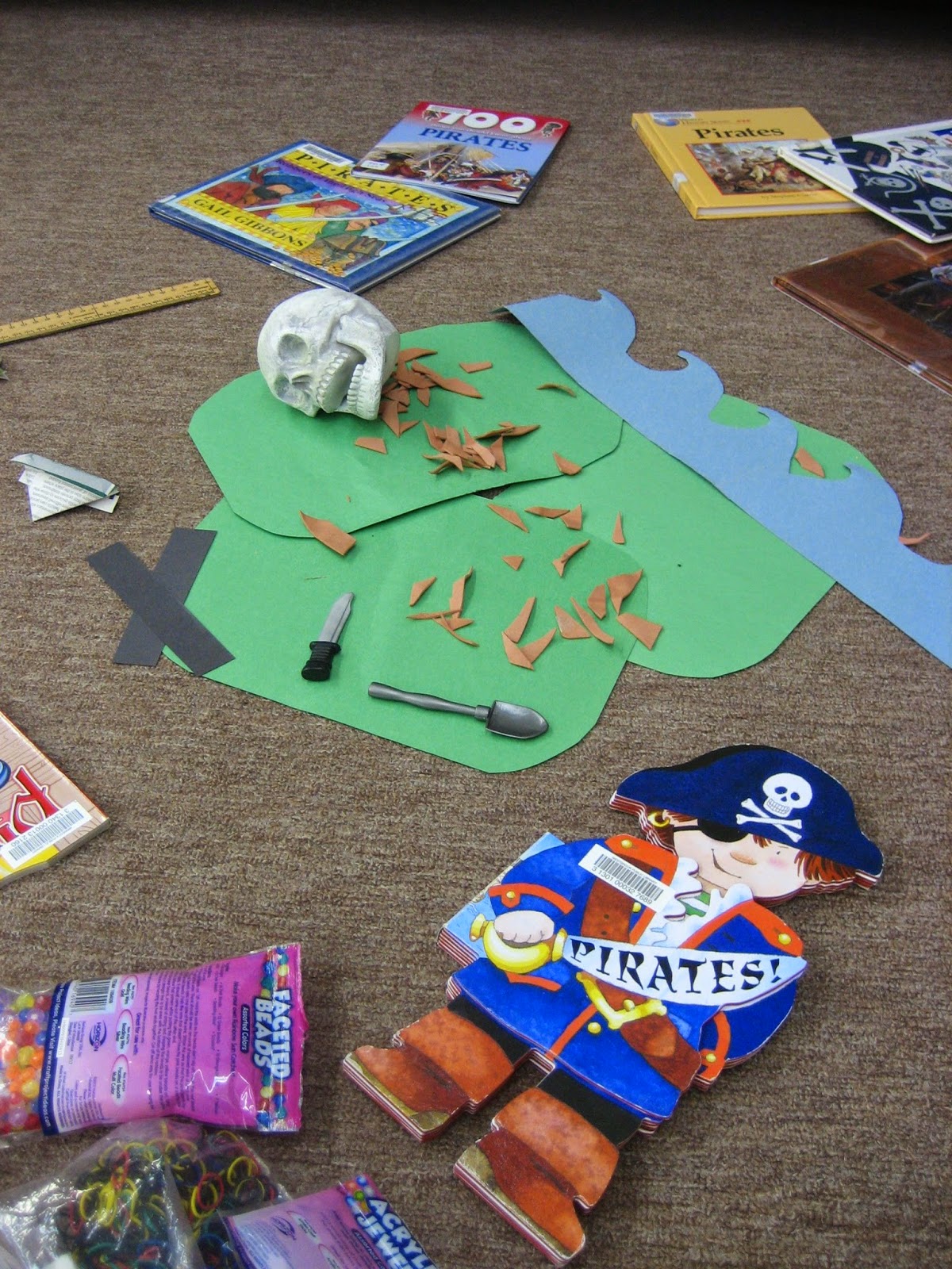Skull, pickax, sword, waves, pirate tomes and paper hats peppered the carpet. Fingerprints? Nay. Booty left behind? Nay. Pirates are too practical to leave forensic evidence.