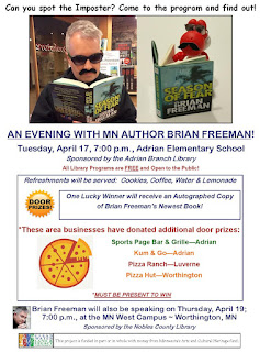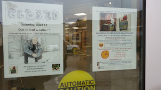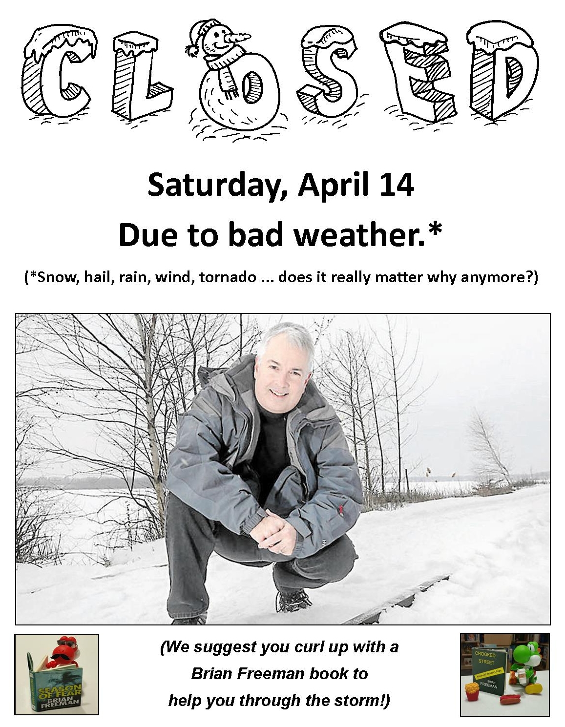 Although we had rather hoped we would not have to use photos of Author Brian Freeman in these kinds of informational signs – it just makes the disappointment (that the Library is CLOSED on April 14) a little bit easier to bear… can’t wait to see Mr. Freeman on the 17th in Adrian. REALLY hoping he has his dog sled packed…. J