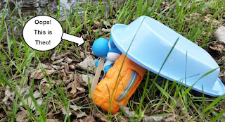 I decided that I simply had to take a photo of Ander making a portage. But where to find water? (An actual pond or lake was out of the question: I live in fear of losing one of the Dragons while doing “creative” photographing of scenarios.) We had a couple of days of heavy rain, so I ventured out into our grove and found a large puddle. PERFECT! I ran back to the house, grabbed the Dragon, backpack, map, cap, and “canoe,” shoved my phone in my pocket and raced back to the spot of what would be my next awesome picture.