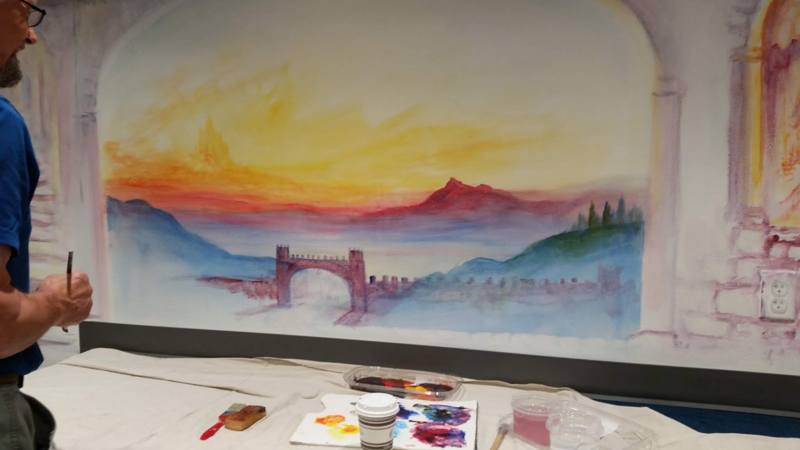 On Thursday, July 26, 2018, artist David Newbatt, who lives in Aberdeen, Scotland, was in southwest Minnesota, on a vacation to visit members of his wife’s family. Under a pre-arrangement set up by Nobles County Library Direct Clint Wolthuizen, Mr. Newbatt was at the Adrian Branch Library to paint a mural in the story time/castle area. The mural was completed on Friday, July 27, 2018. The following week, Mr. Newbatt painted another amazing mural, this time at the Nobles County Library in Worthington, in the Teen section. If you get a chance, stop in to see both murals, as photos do not do the incredible artwork justice.